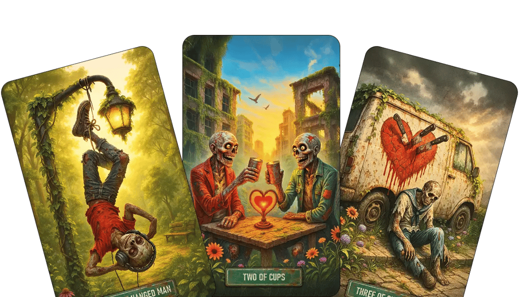 Tarot gives structure. The zombie world gives a story. Together, they turn “what now?” into something you can actually work with.