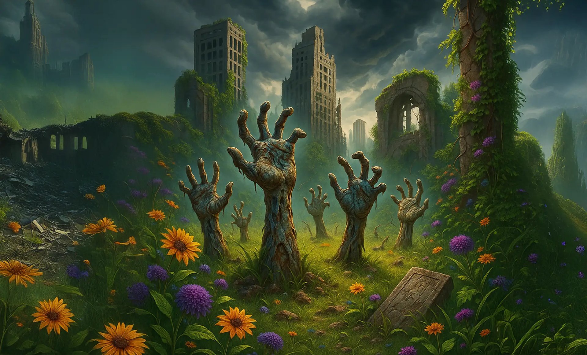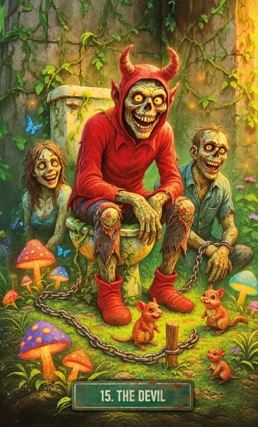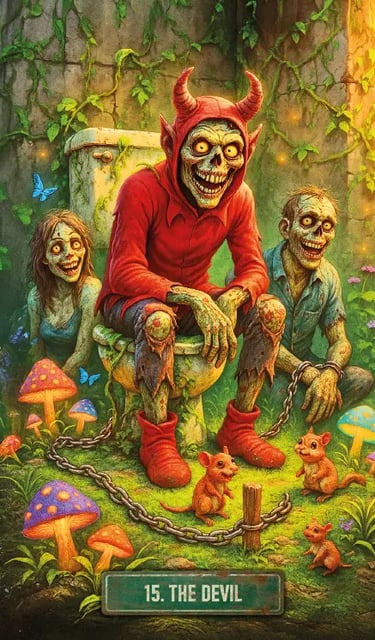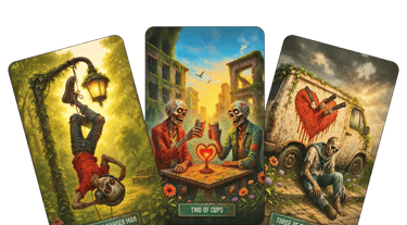 Zombie Tarot is a full 78-card tarot deck built on the classic Rider–Waite structure, but seen after the world has ended. Each card lives in a zombie-filled, overgrown city where ruins and wild greenery share the same frame. The focus is on change, resilience, and emotional insight—with a dose of dark humor, not gore. Life fell apart… and something wiser got back up.