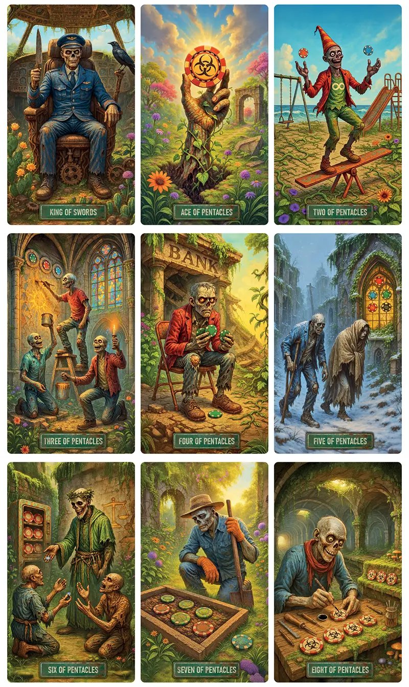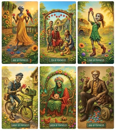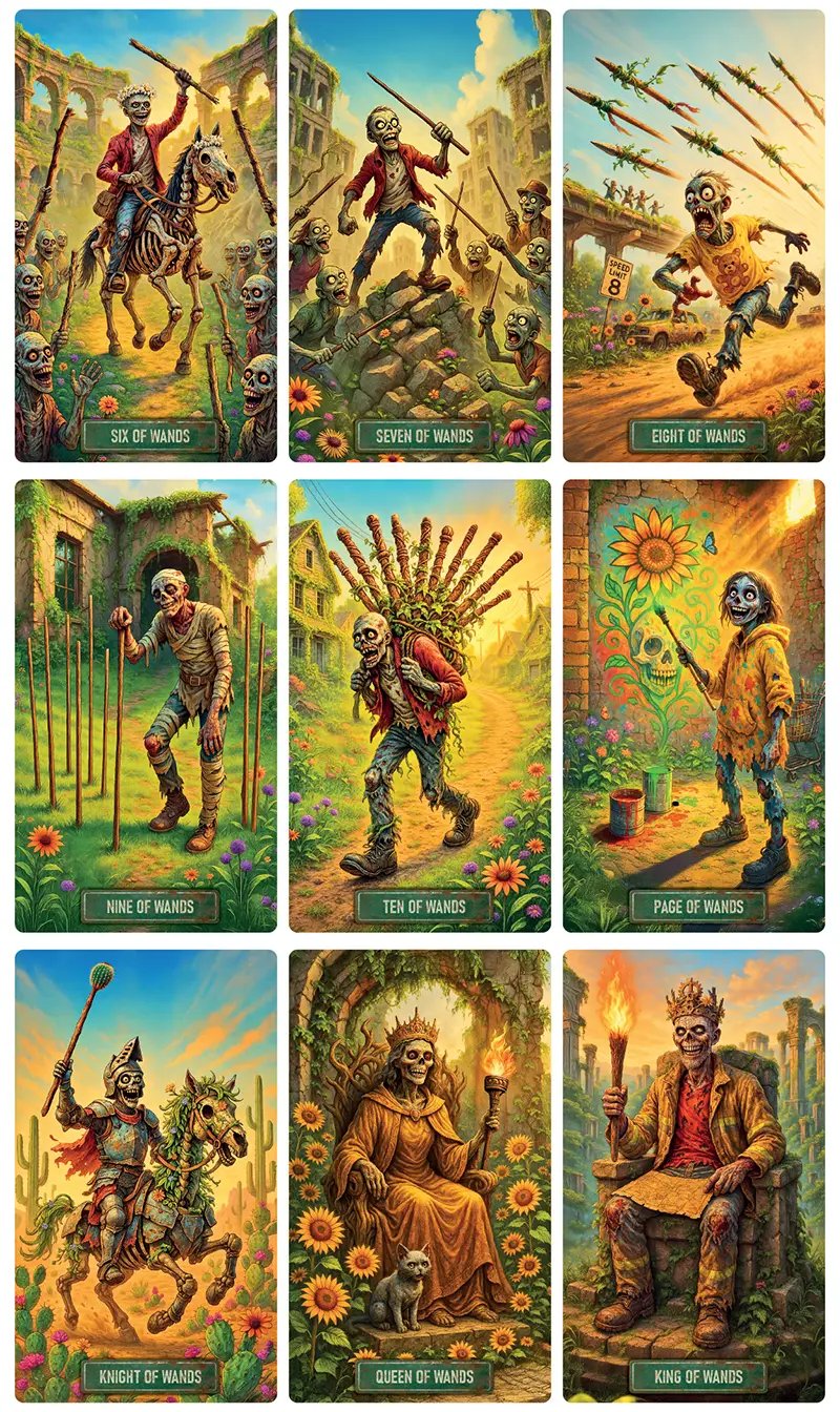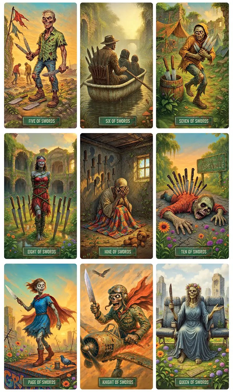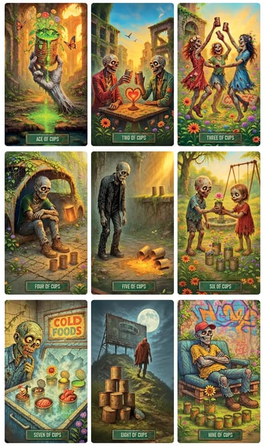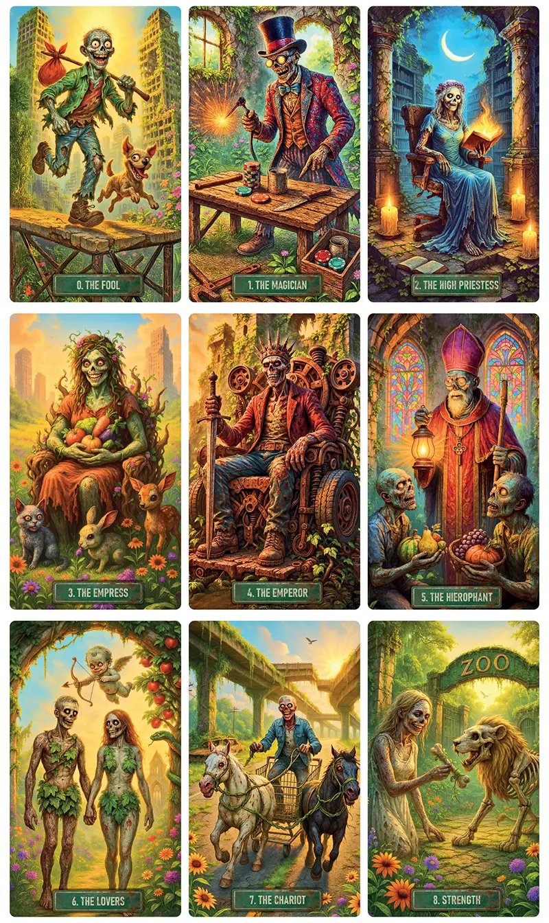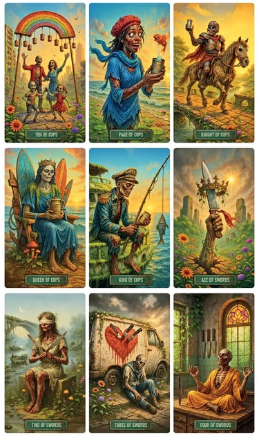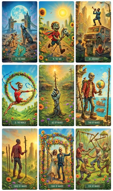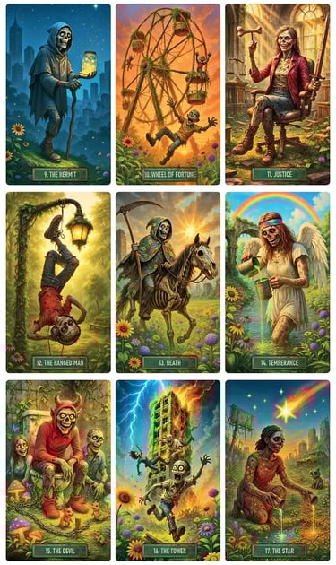 Welcome to the full horde. Here you can browse every card in the Zombie Tarot deck—from wandering fools on broken highways to quiet moments in overgrown ruins. Take your time, explore the details, and see how this little afterlife of symbols holds stories of endings, choices, and new beginnings.